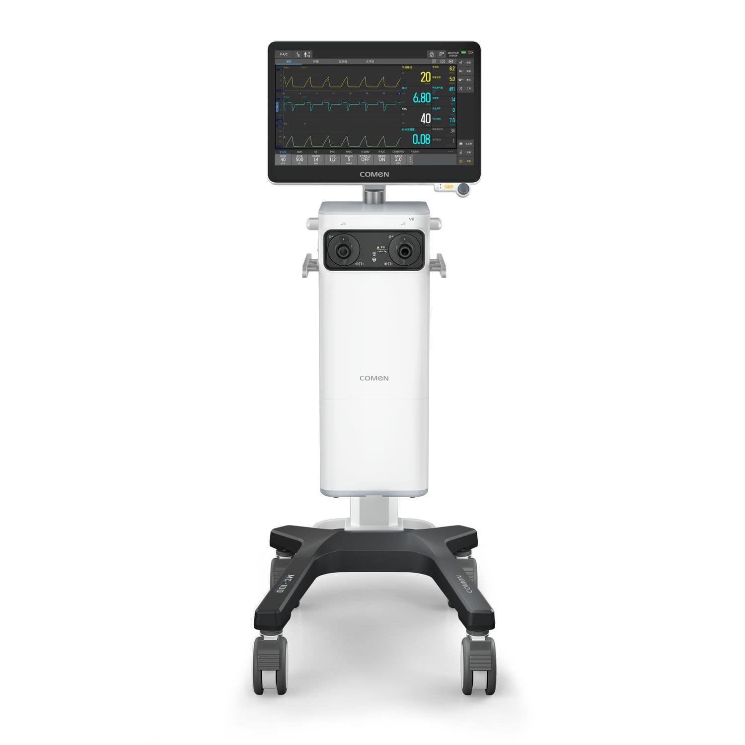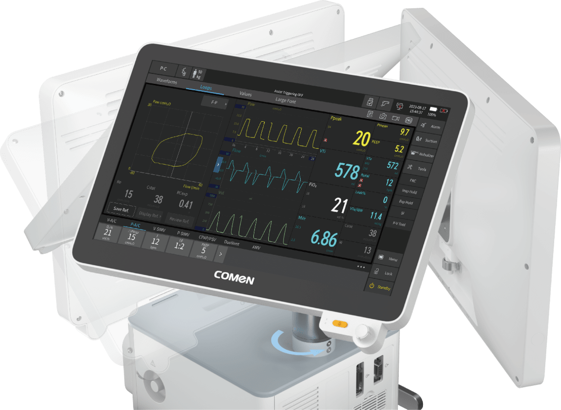 The Comen V8 is a next-generation mechanical ventilator designed to deliver precise, reliable respiratory support across all clinical scenarios. Featuring an 18.5-inch detachable touchscreen, dual-drive technology, and intelligent iV-Cycle synchronization, the V8 ensures optimal patient comfort and safety. With comprehensive invasive and non-invasive modes, neonatal support, and advanced lung-protection strategies, it empowers clinicians to provide superior care in critical environments.