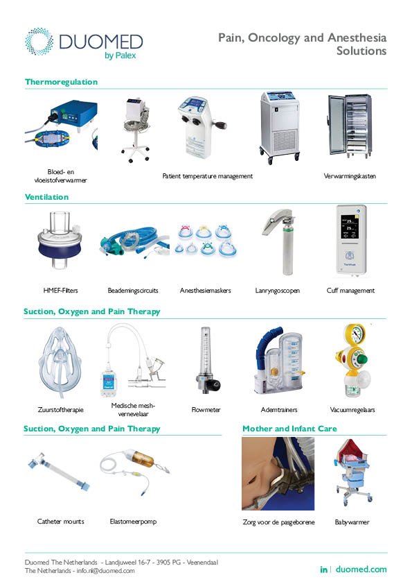 Back Pain, Oncolology & Anesthesia solution Range 2026 Temperature ManagementHeating cabinetsVentilationSuction TherapyUltrasound gel Contact us about this product Documents NLD Pain, Oncology & Anesthesia Portfolio 2026