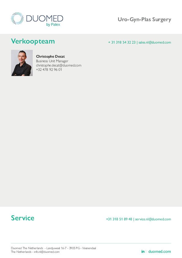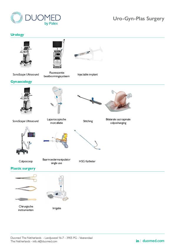 Back Urology Gynaecology Plastic Surgery Range Duomed NL Urology, Gynaecology & Plastic SurgeryProstate treatmentRobotic microscopeVUR treatmentColposcopy Contact us about this product Documents NLD UGP Portfolio 2026 Related products Endoscopy Range Duomed NL Endoscopy, ETI, Ultrasound Show product info Abdominal & Vascular Surgery Range Duomed NL Abdominal & Vascular Surgery Show product info Technical Service - Excellence in Service Duomed NL Our technical service department is responsible for the installation, repairs and maintenance of your products. Show product info Imaging Range Duomed NL Imaging & Ultrasound Show product info