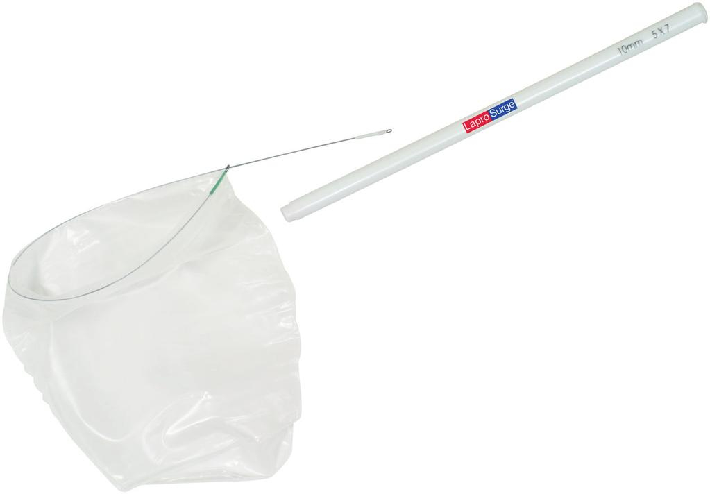 The Endo Pouch with Memory Wire comes rolled up inside a 10mm tube for introduction through a 10mm/12mm port and a pusher drives the bag forward into the abdominal cavity. This simple deployment method enables quick and safe insertion through any 10mm/12mm port, negating the need for an additional port exclusively for bag introduction.