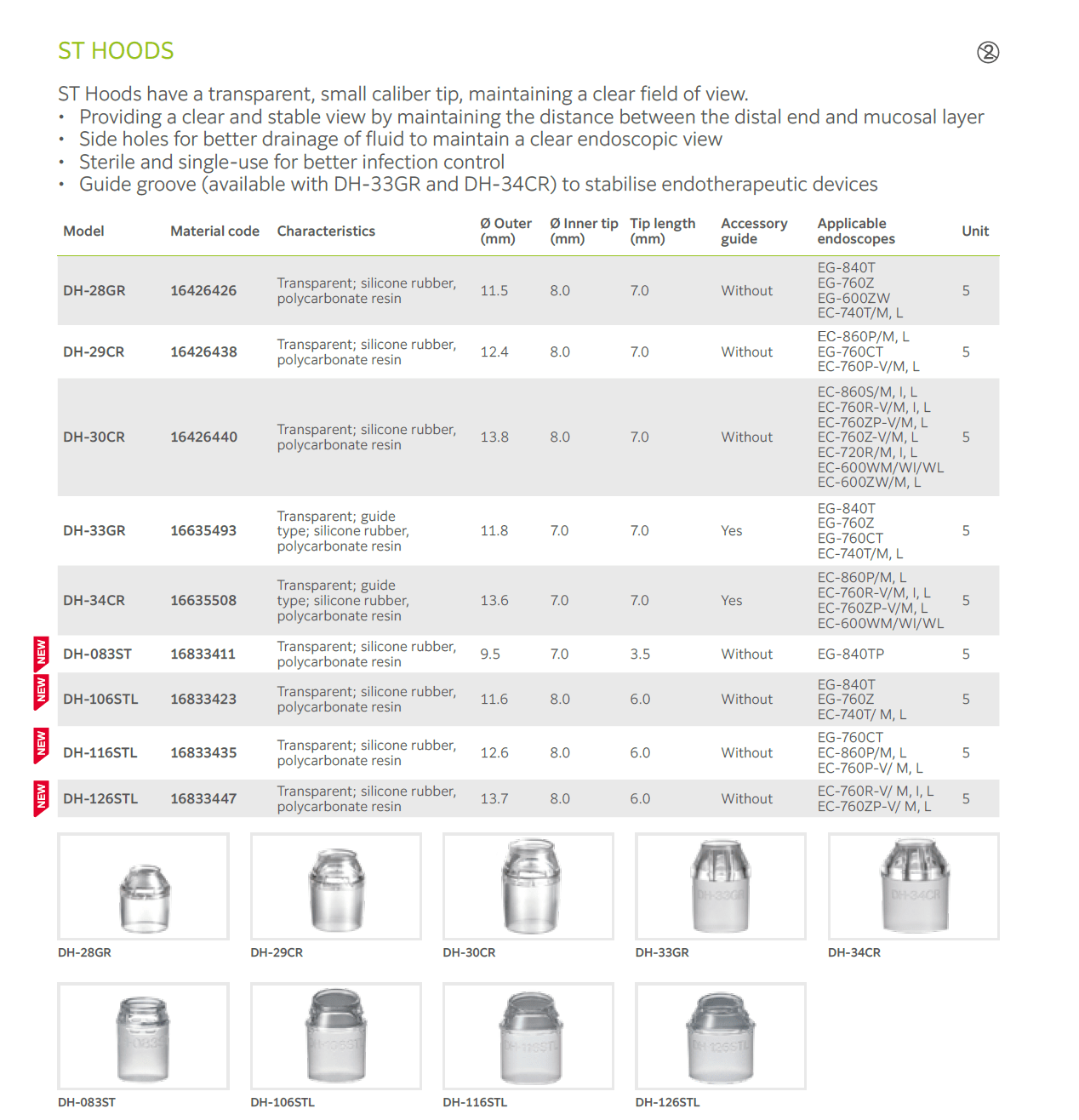 | DH-33GR | Capuchon distal ST-Hood transparent ; type de guide, caoutchouc silicone, résine polycarbonate | 11.8 mm 7.0 mm | 7 mm | EG-840T EG-760Z EG-760CT EC-740T/M, L | 5 |
