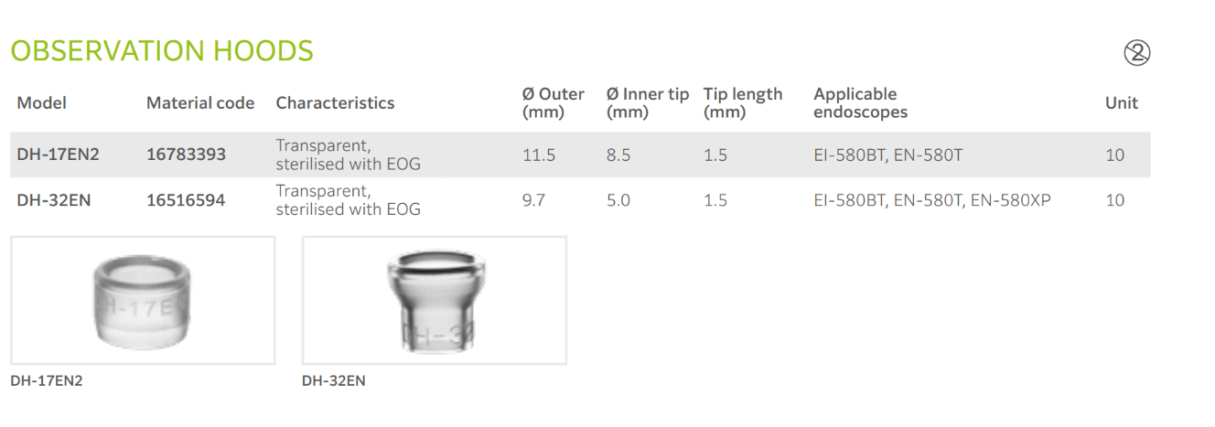 | DH-17EN2 | Capuchon distal Observation Hood Transparent, stérilisé avec EOG | 11.5 mm 8.5 mm | 1.5 mm | EI-580BT EN-580T EN-840T | 10 |