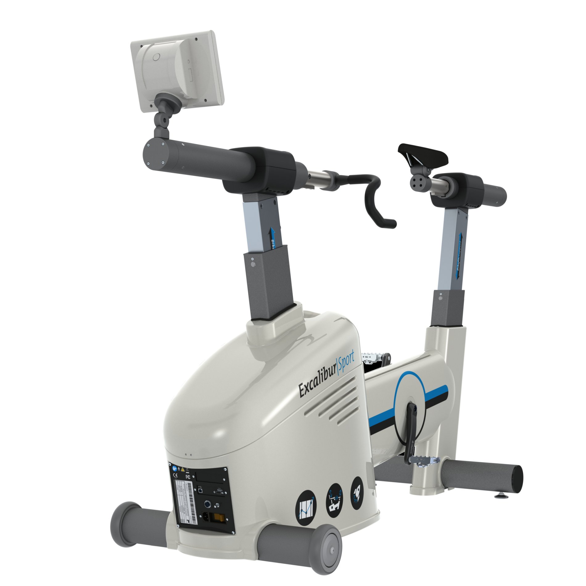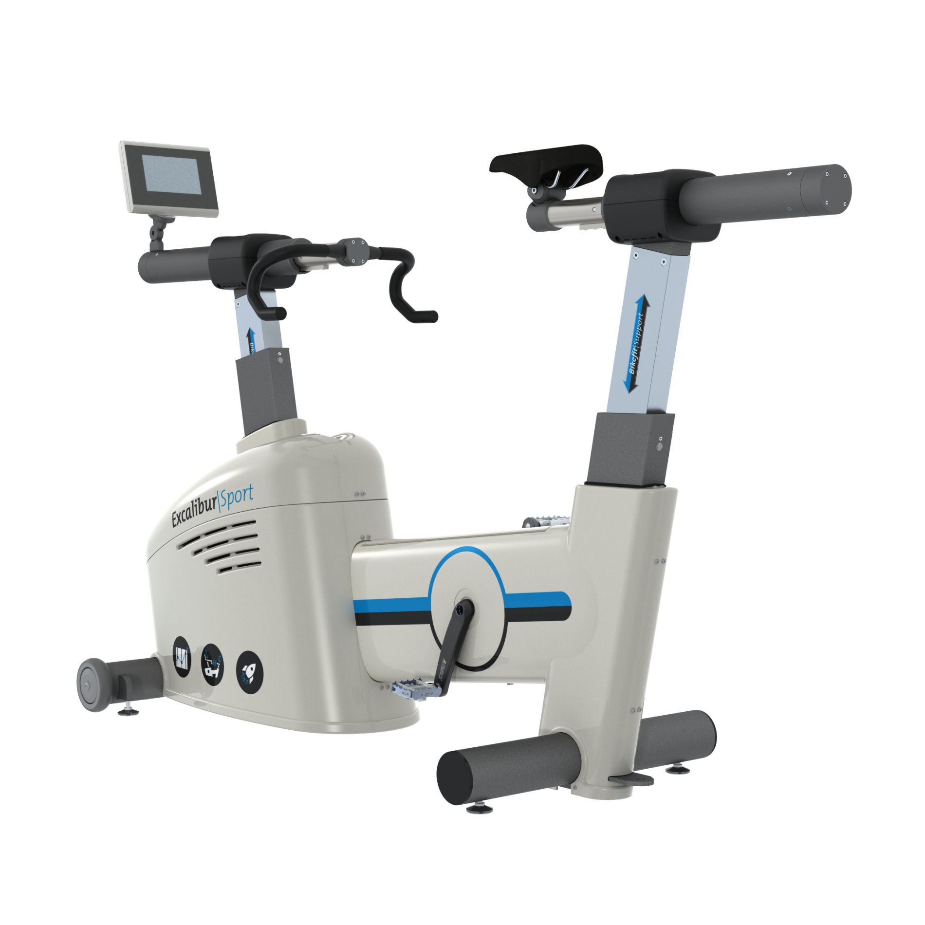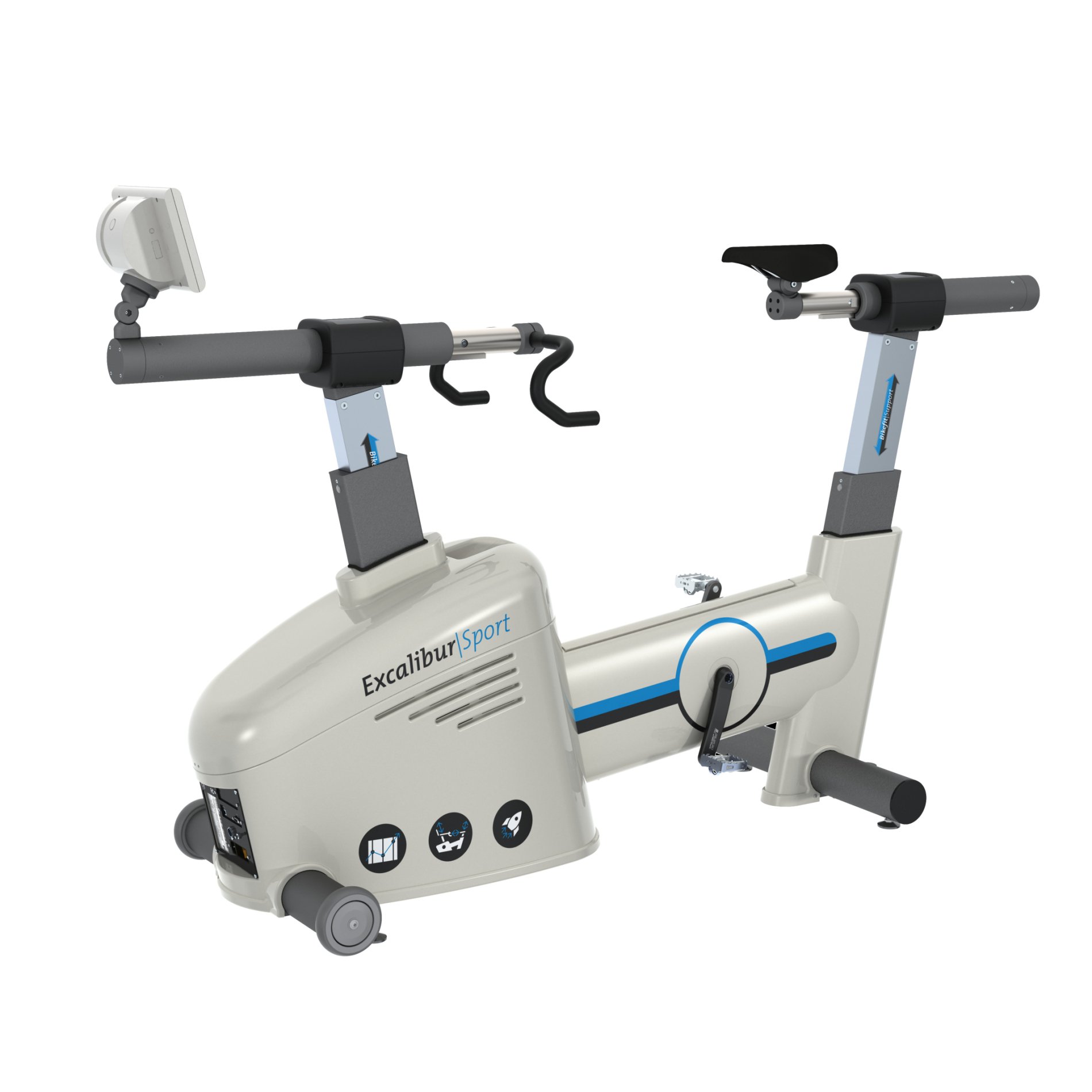 La position du guidon de l’Excalibur Sport est entièrement ajustable en hauteur et en longueur. Le guidon peut être réglé horizontalement sur une plage de 169 mm et verticalement sur une plage de 390 mm, à l’aide de l’unité de contrôle ou du logiciel LEM. Le sujet testé peut utiliser le guidon pendant les ajustements.